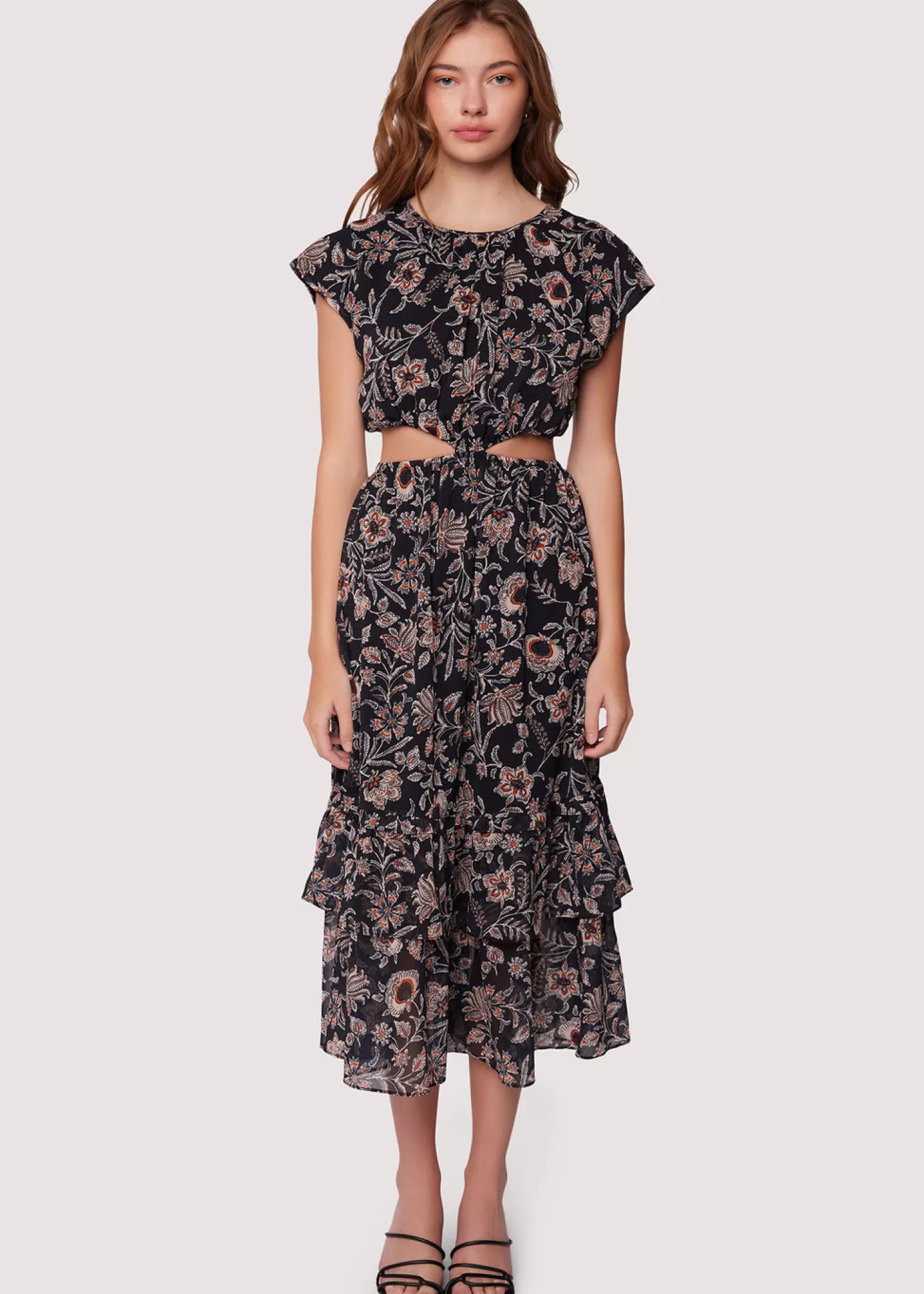 Steal the show by donning the Eclipse of the Heart Midi Dress! This two-in-one style is perfect for the set lover. The bust features a relaxed fit with a jewel neckline and feminine cap sleeves. Both seams along the waist are elastic and are attached by a single piece of fabric. This keeps the silhouette in place while also giving you sultry vibes with open sides and back. The back details two ties as you wander down to a tiered ruffle skirt. Classy and on trend, you’ll receive all the compliments!