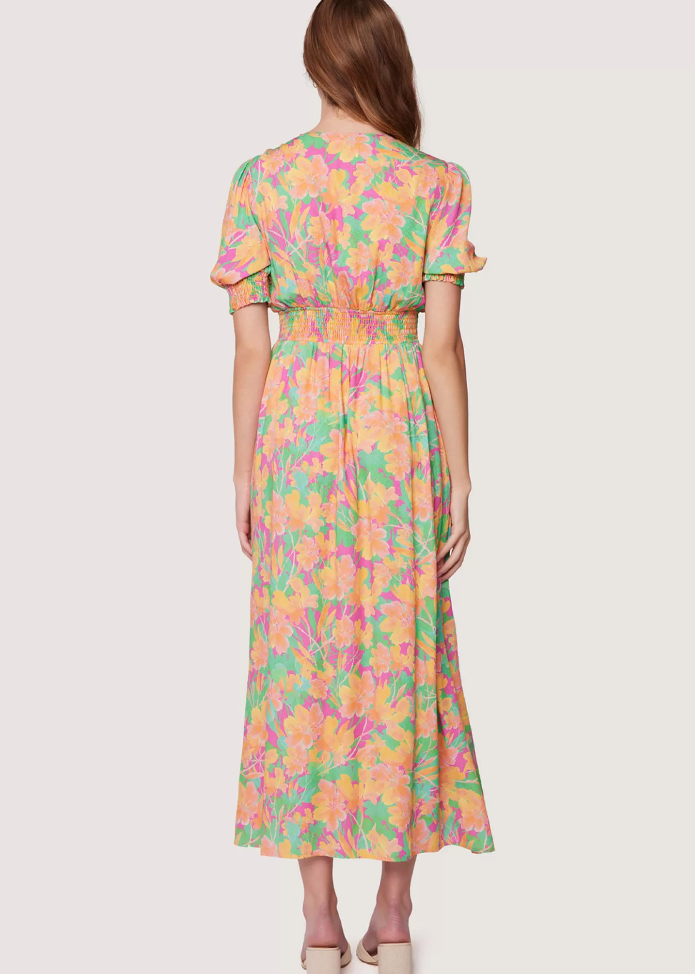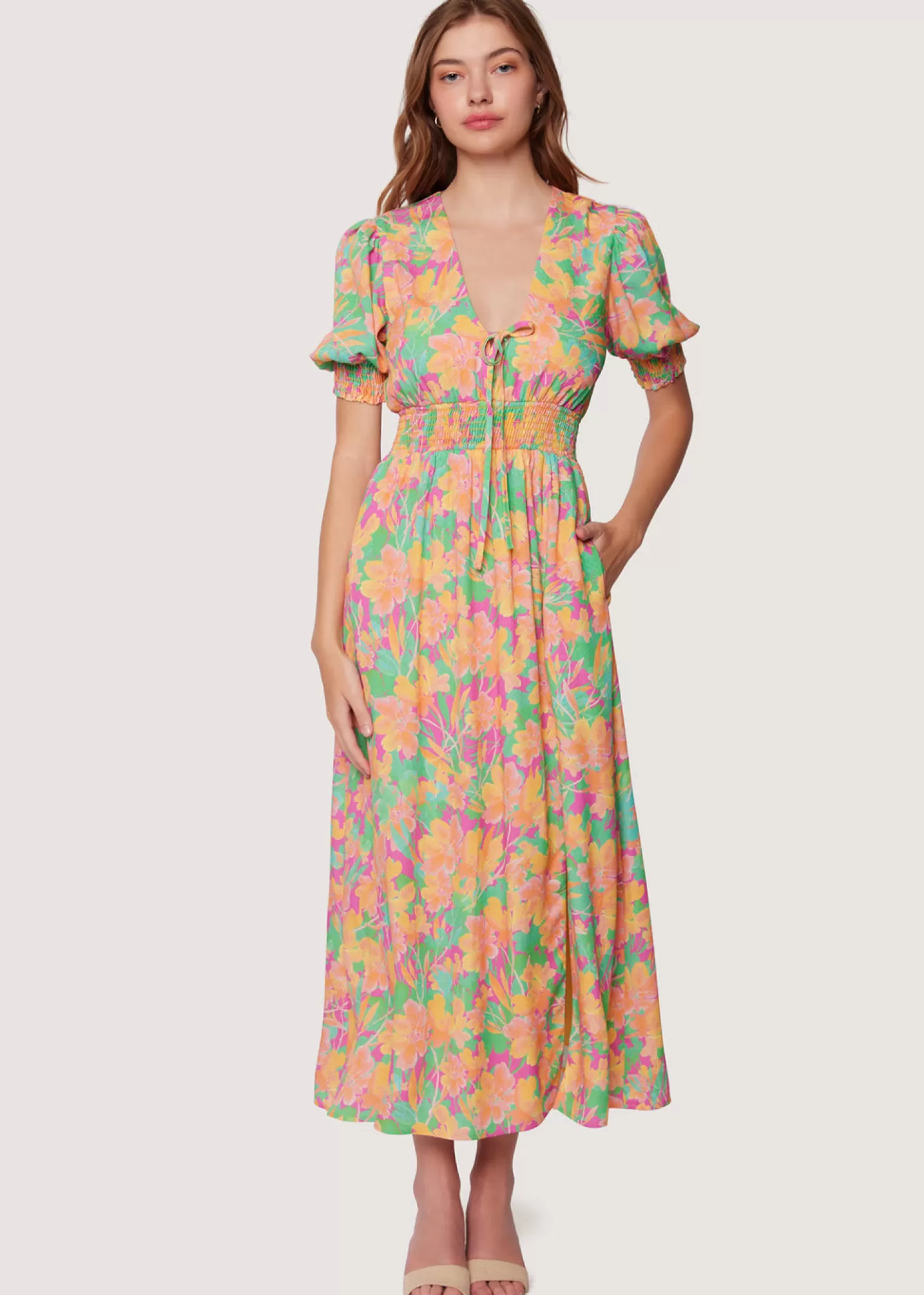 Nothing can get you down in the Eternal Lights Maxi Dress! A retro floral print shapes this effortless A-line silhouette for an effortless spring look. This style will flatter any body as it features a smocked waist for cinching, high leg slit for movement, and a deep V bust accompanied by an adjustable tie. The sleeves are securely fitted to the arm thanks to a smocked hem detail and you’ll be able to securely store your phone and keys with the hidden pockets.