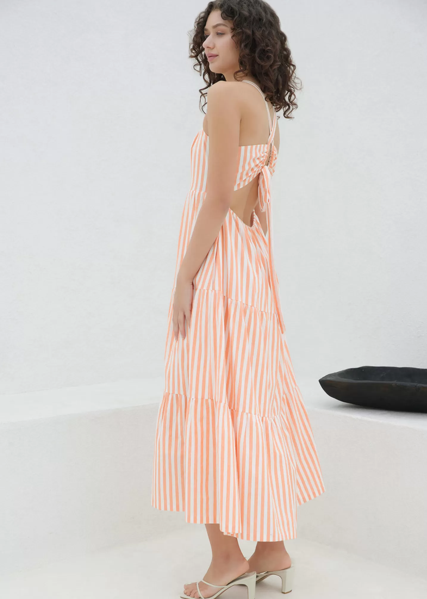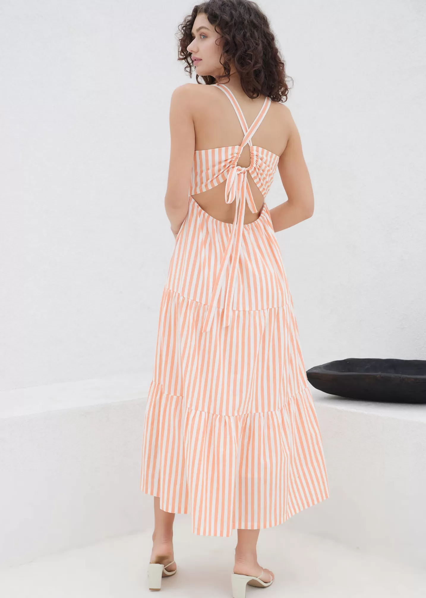 Charm your way through life in the Sunset Stripe Maxi Dress! This best seller has been upgraded to a vivacious shade of orange so you can flaunt it on your next vacation. Featuring a classic square neckline, the back design becomes a subtle sultry look as thick straps criss cross in the back, creating a keyhole and back bow. Below the tie is another back cutout and is secured by an elastic band. This style is fully lined with hidden pockets.
