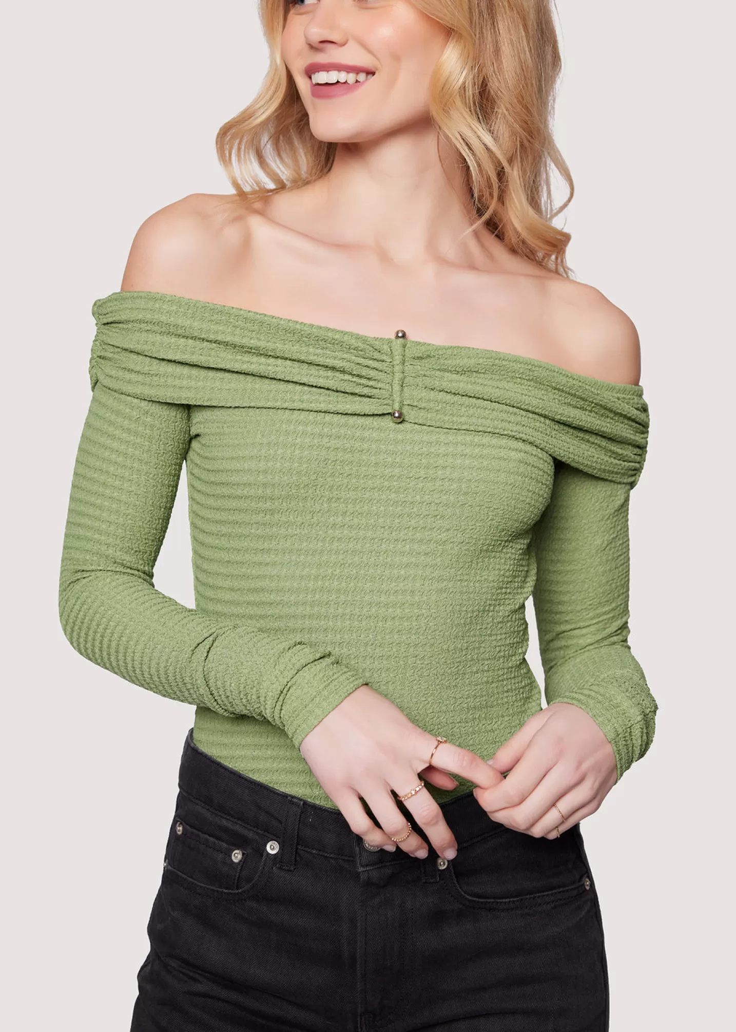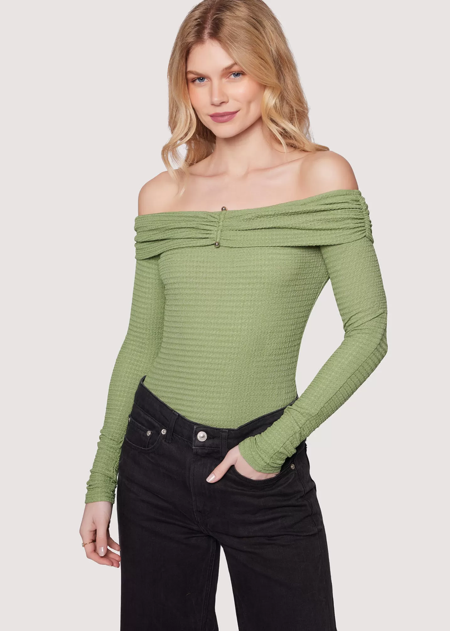 Sophistication and boldness come together with the Agave Nectar Bodysuit. This lush bodysuit shapes an off-the-shoulder design, and will easily become your favorite staple with its soft and stretchy material. This piece offers an element of edge with a small metal rod detail in the center of the bust seam, for both an eye catching look and functionality to hold this silhouette in place. Pair the beloved top with your favorite jeans and boots while you transition into fall.