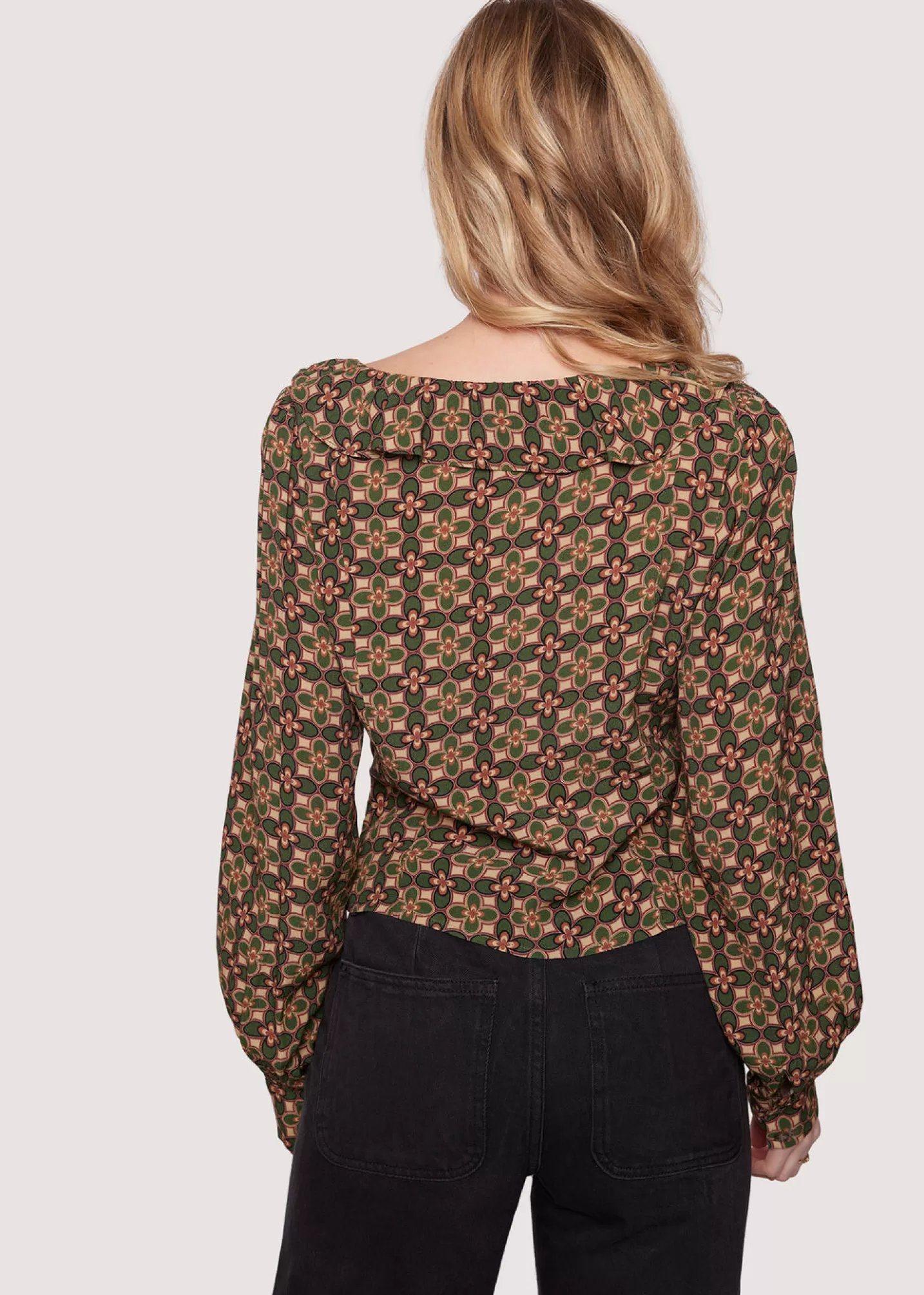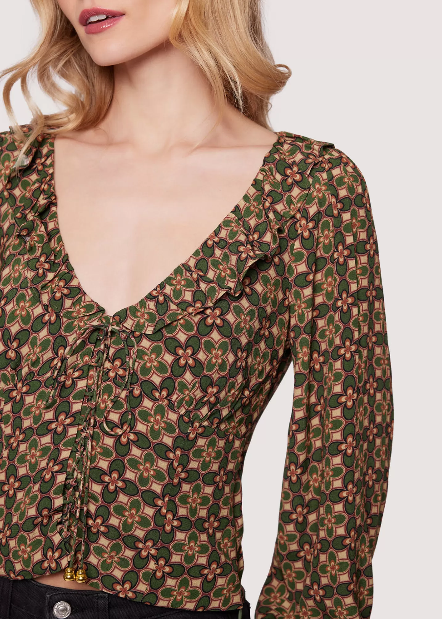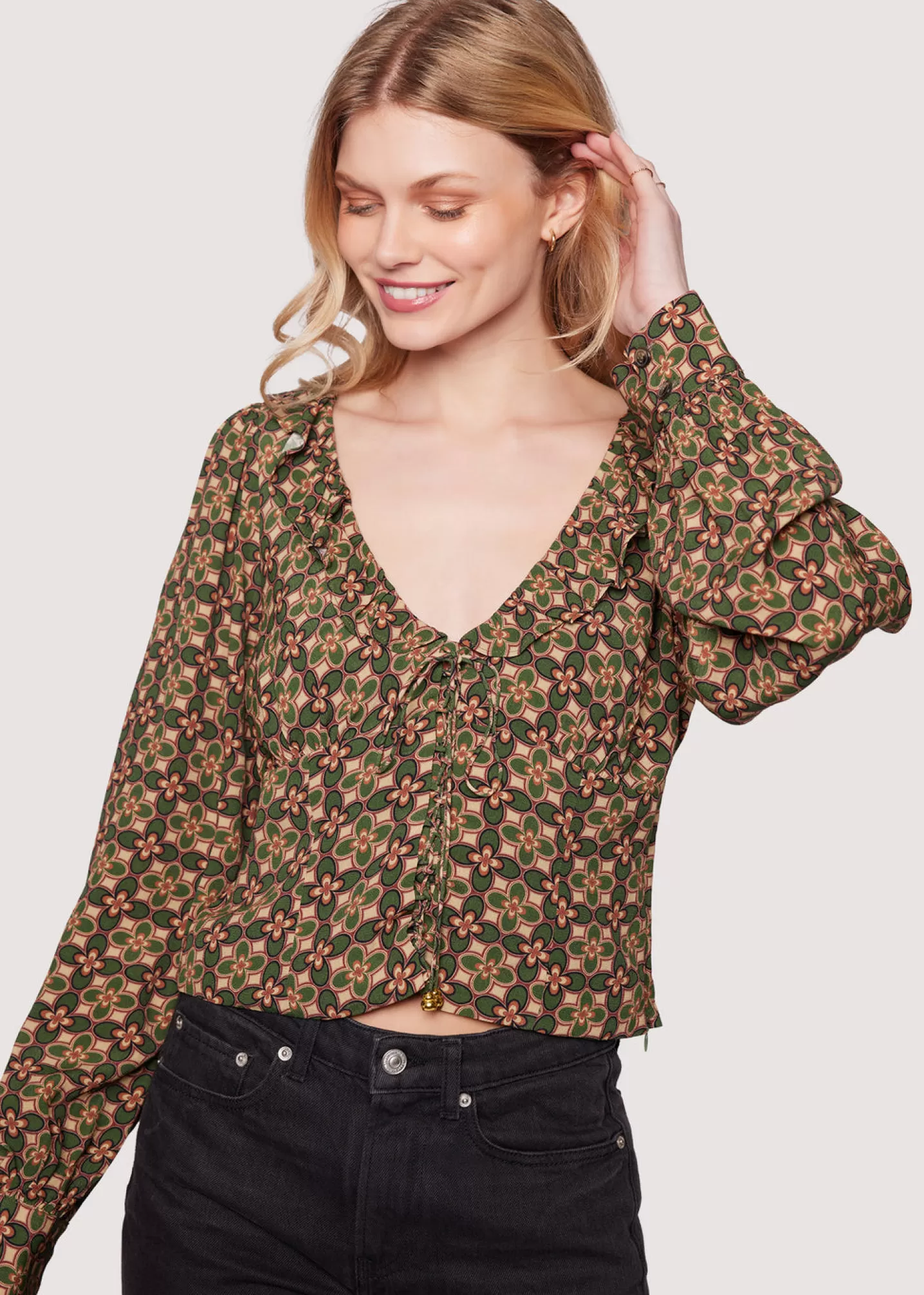 With its relaxed silhouette and enchanting print, the Pinnate Leaves Top invites you to express your sense of style! Featuring a beaded tie front, ruffled v-neckline and long cuffed sleeves, this top is perfect for a dressy and fashionable look.