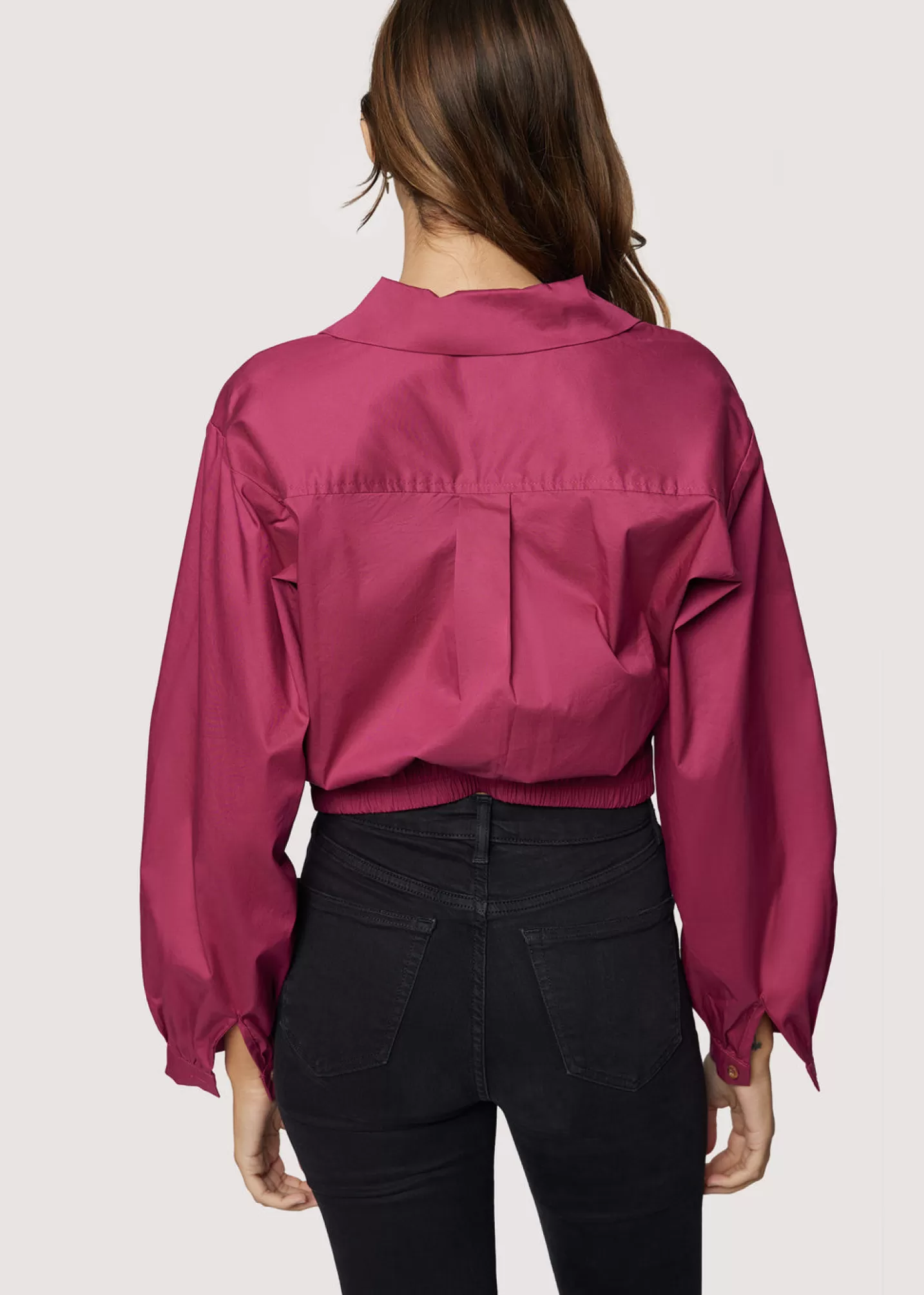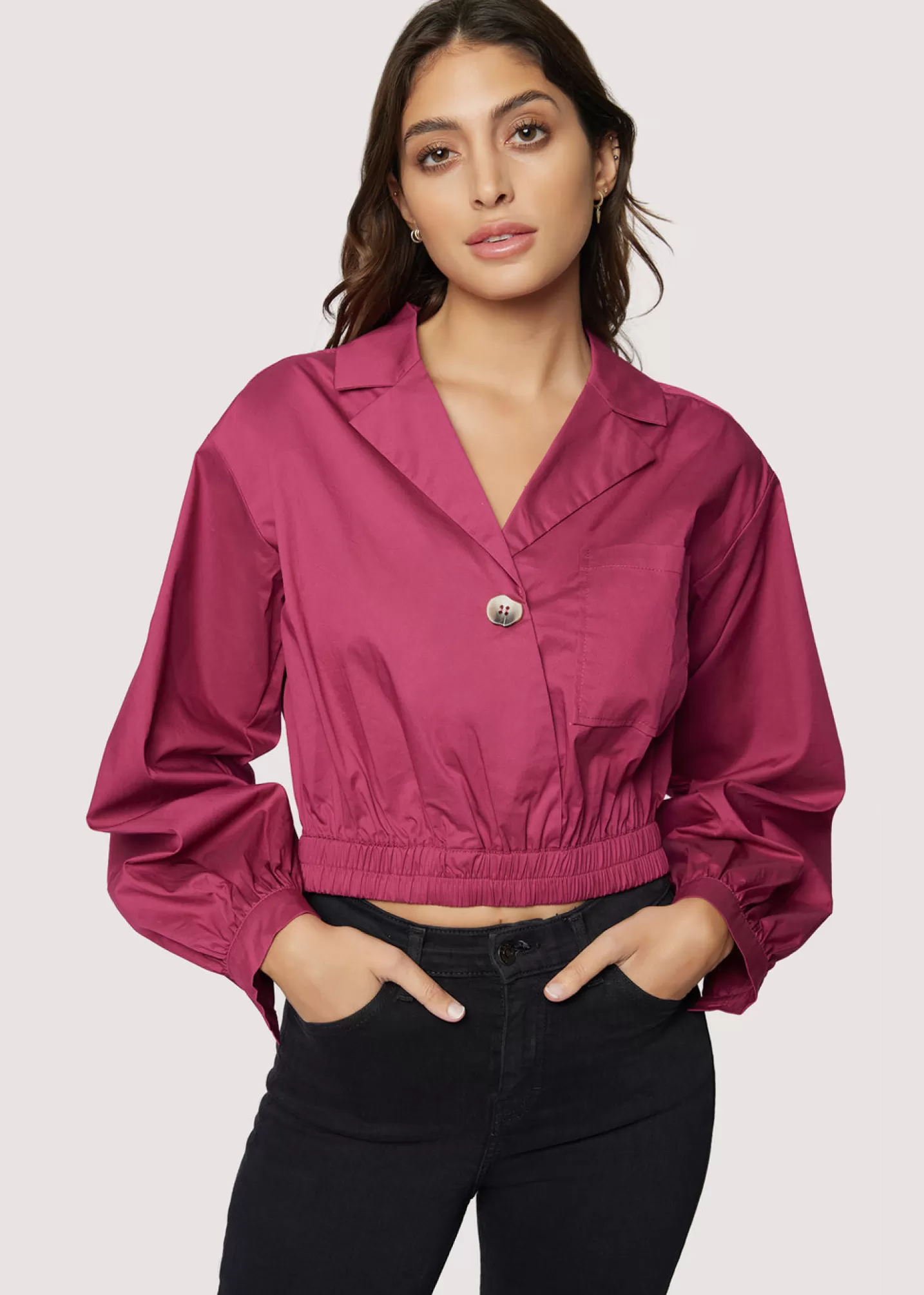 Keep it cute and classic with the Soul Mate Shirt. This deep plum shade drops into a wrap illusion with a surplice neckline held in place by a single wooden button. The bottom edge is an elastic band ensuring a cropped length so you can pair with your favorite fall bottoms.